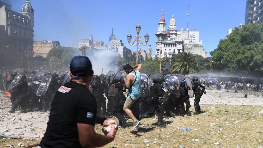 Um forte aparato policial, visando intimidar as manifestações, desde o início do dia revista carros e vans que se dirigem ao centro de Buenos Aieres e tenta impedir que a população se manifeste perto do palácio legislativo. Ativistas atiram pedras e garrafas ao tentar derrubar as cercas metálicas instaladas para evitar que a marcha alcance a praça estratégica em frente ao Congresso.