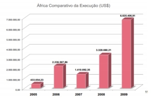 Conforme documento institucional (2009), em termos de investimentos da ABC em cooperação internacional no governo Lula, a África representa 50% dos valores investidos, seguidos da América do Sul, Ásia, América Central e Caribe. Ademais, os valores dispostos e executados têm crescido desde 2005 de maneira exponencial, conforme gráficos abaixo.